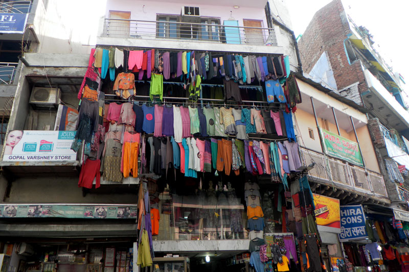14.12.2011 - Indien - In der Hauptstadt Delhi hat ein Kleiderladen unweit vom Main Baazar seine Auslage in rechter Höhe