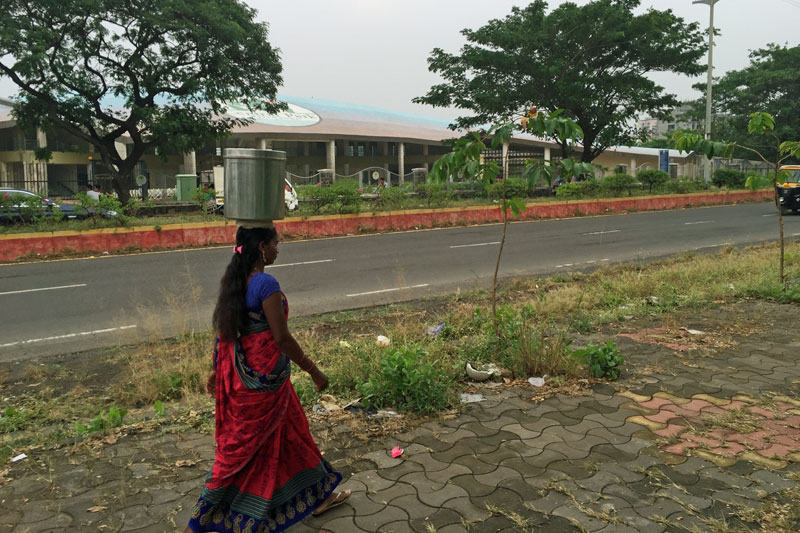 22.11.2015 - Indien - In Khargar (alkoholfreier Ort) in Navi Mumbai - Indische Frau schleppt schwer vor dem Central Park