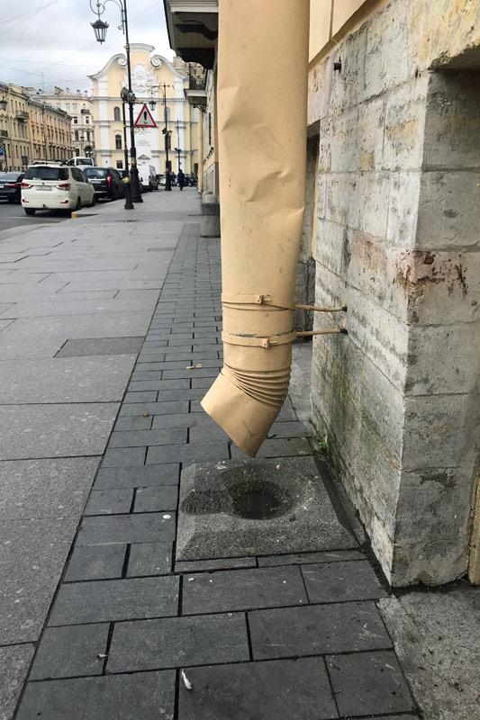 04.10.2019 - Russland - Es regnet - und neben dem Wasser von oben ergiessen sich die Regenrinnen auf den Gehweh in Sankt Petersburg