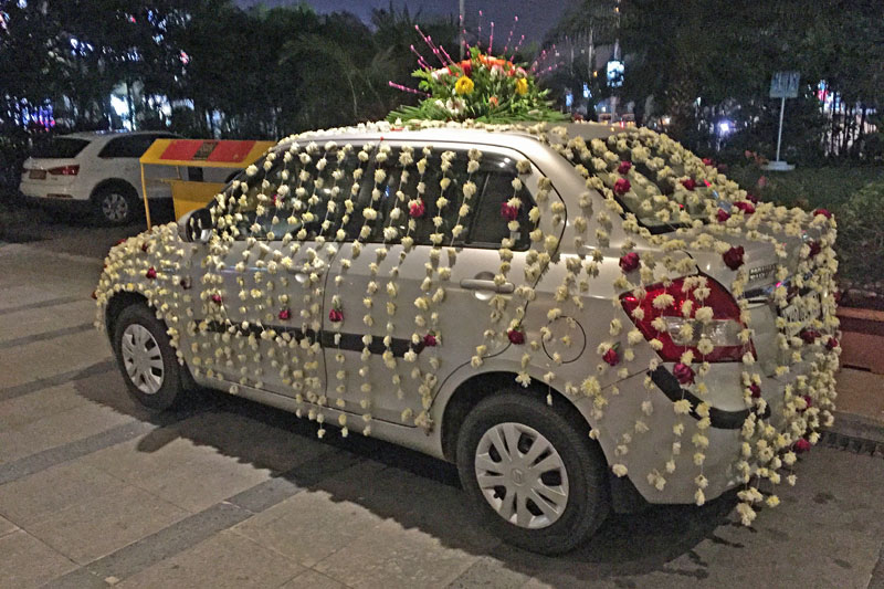 13.12.2015 - Indien - In Vashi in Navi Mumbai - Typisch indisches Hochzeitsauto vor dem FourPoints Hotel