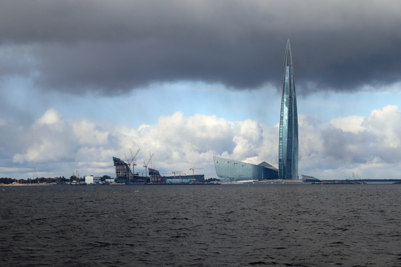 05.10.2019 - Russland - Die Fahrt mit dem Schiff zum Schloss Peterhof lohnt sich: hier der Gazprom-Tower (Lakhta Center) - höchster Turm in Europa