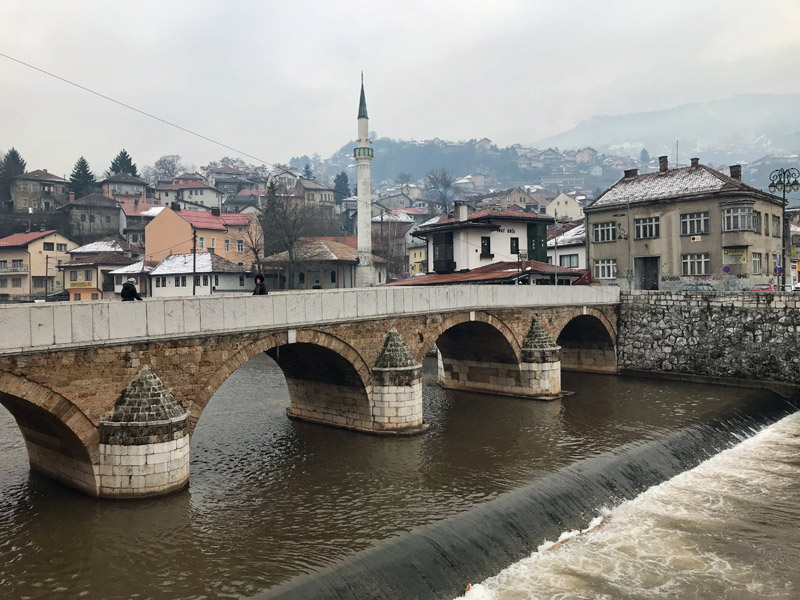 27.12.2018 - Bosnien und Herzegowina - Der Fluß Miljacka in Sarajevo bietet sich für einen Spaziergang mit Brücken und dem Alten Rathaus an, hier die Seher-Cehaja-Brücke