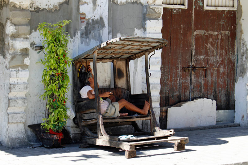 03.01.2016 - Philippinen - Vigan (Luzon) ganz im Norden - Philippinin relaxt rauchend in der Hollywoodschaukel-artigen Sitzbank