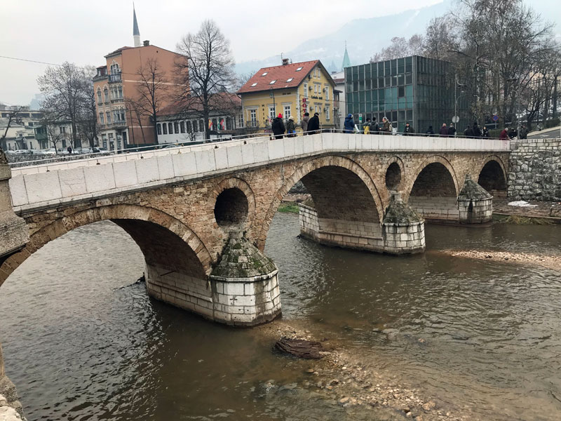 27.12.2018 - Bosnien und Herzegowina - Die Lateinerbrücke über den Fluß Miljacka in Sarajevo ist ja recht geschichtsträchtig: hier wurden 1914 der östereichische Thronfolger mir Gemahlin ermordet, was zum Ersten Weltkrieg führte