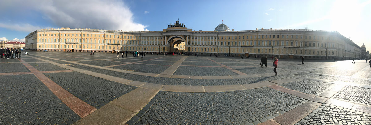 01.10.2019 - Russland - Im Panoramablick der sehr große Palastplatz an der Eremitage in Sankt Petersburg (mit Sonne nach dem Museumsbesuch)
