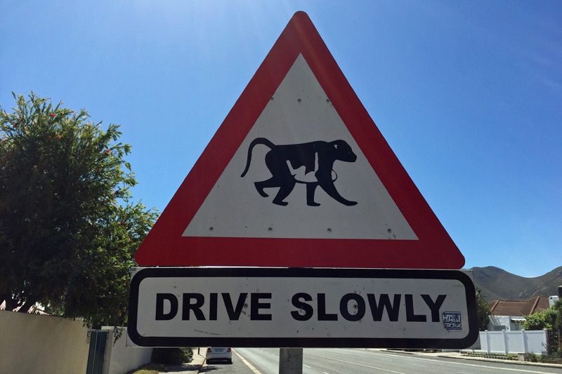 26.11.2016 - Südafrika - Ich verlasse Hermanus und sehe ein "Fahr Langsam" Verkehrsschild mit Affen