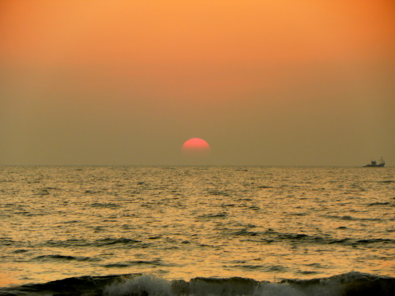 07.01.2012 - Indien - Erholung in Goa - herrlicher Sonnenuntergang in Agonda am Meer mit Schiff am Horizont
